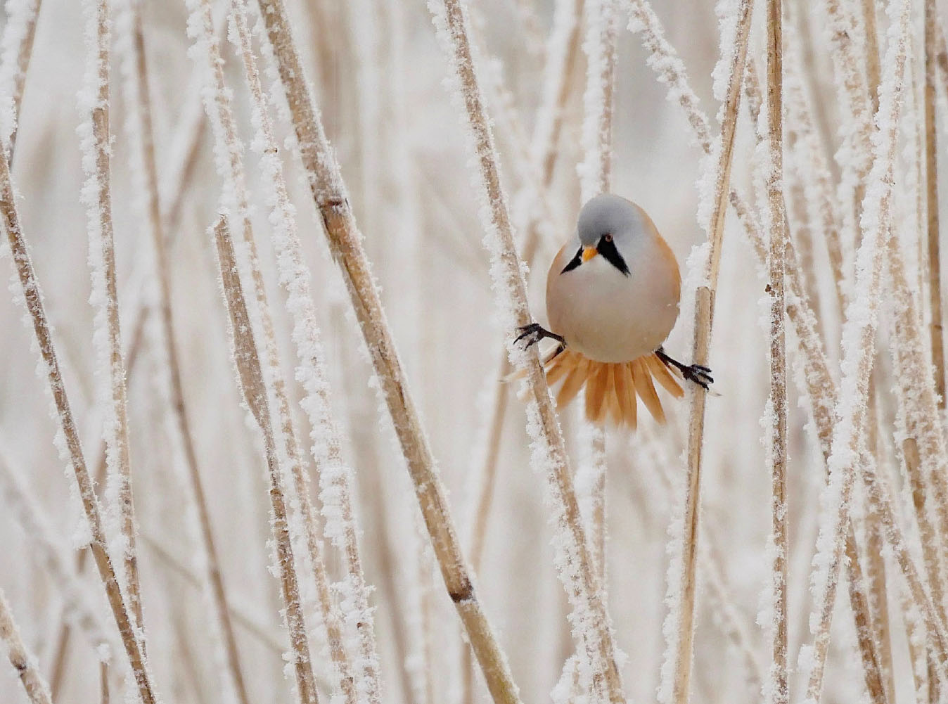 Met zonnig en windstil weer heb je de beste kans om ze te zien. Ik wilde ze graag in een winterse omgeving vastleggen. Hoewel ik een hekel heb aan kou, ging ik op een echte winterdag toch naar de Rietputten. De baardmannetjes vlogen heen en weer tussen een lager gelegen veld en de rietpluimen, waar ik stond te wachten om ze te kunnen fotograferen. Na zo’n anderhalf uur koukleumen kwamen ze hoog in het riet zitten en kon ik deze foto maken.”