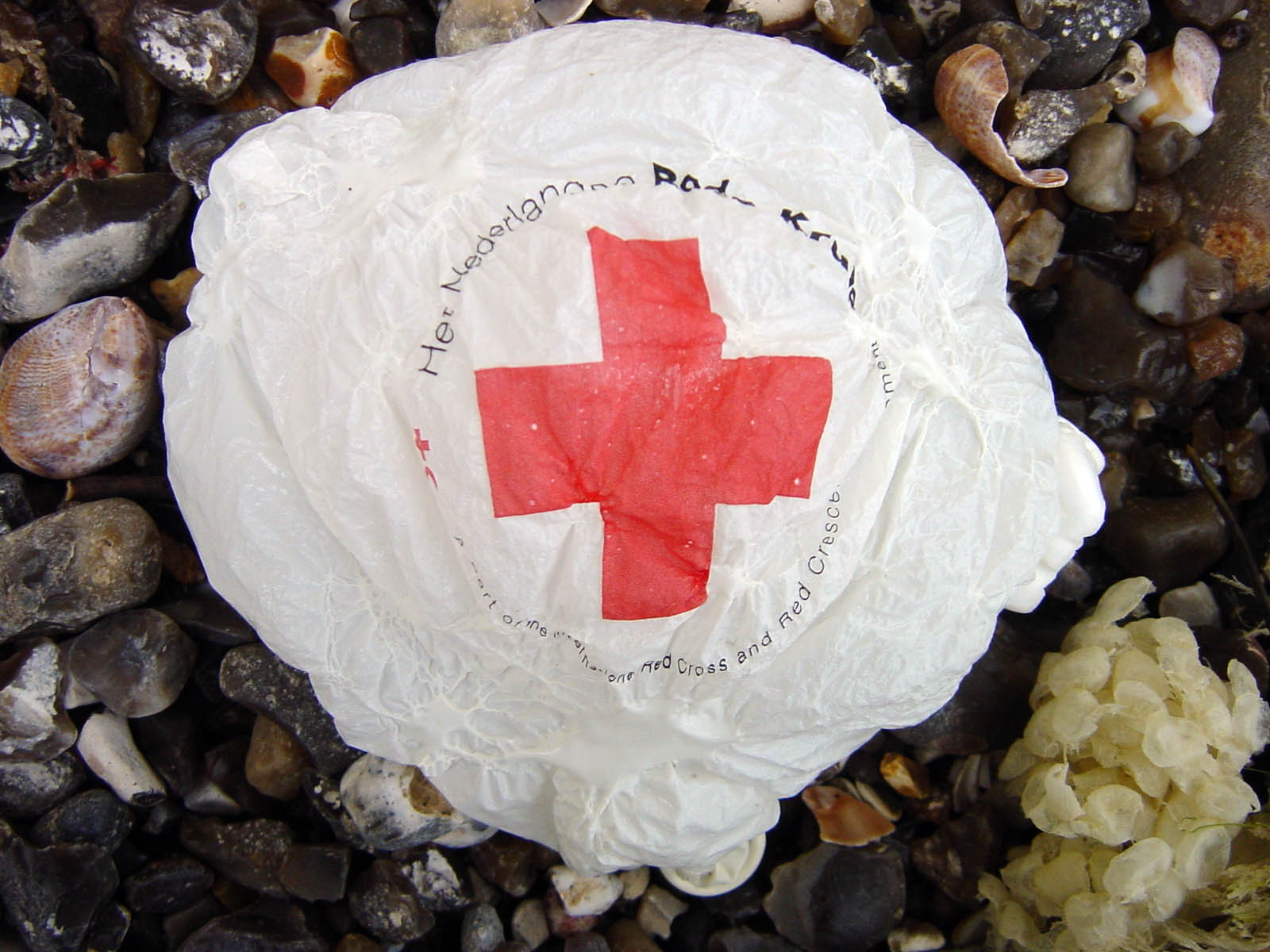 Foto: een Nederlandse ballon van het Rode Kruis, aangespoeld op een Frans strand (Wageningen UR)