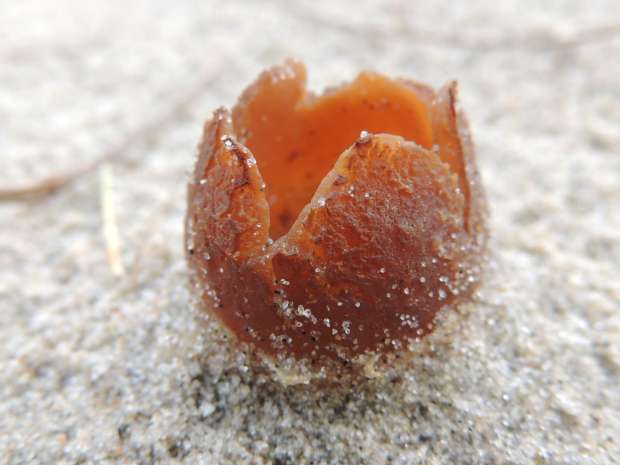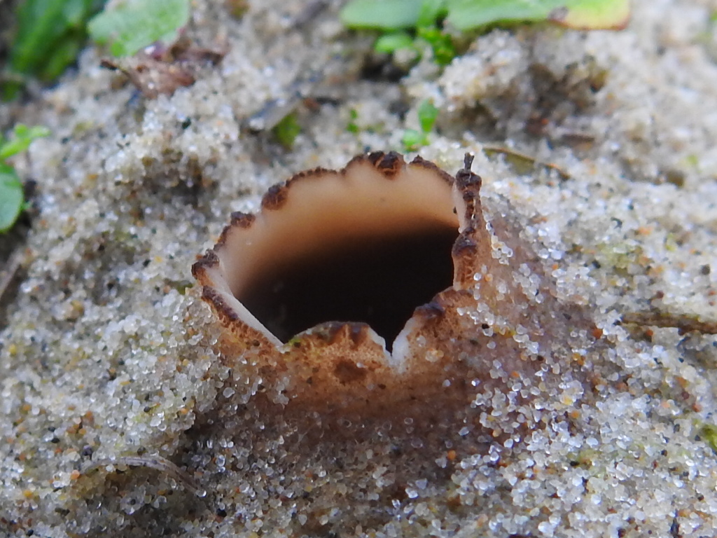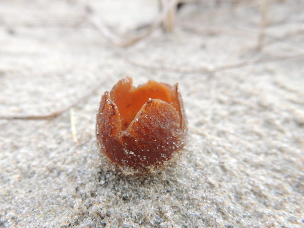 De Kwade Hoek op Goeree Overflakkee is een bijzondere plek. In november oogt het als een woeste uithoek, maar wie rondloopt en zich de ogen goed de kost geeft, zal er veel vogels ontdekken. En wie ook naar beneden kijkt en het zand checkt, ontdekt tussen het helmgras een heel apart paddenstoeltje: het zandtulpje. Je moet echt goed zoeken, want hun 4-6 stervormig lobjes steken als een mini-tulp van hooguit 3 cm maar net boven het zand uit. En dan zijn ze soms ook onopvallend dadelbruin, maar als ze vers zijn soms ook wat opvallender oranjebruin. Ze groeien op (rottende) helmwortels in de buitenduinen.