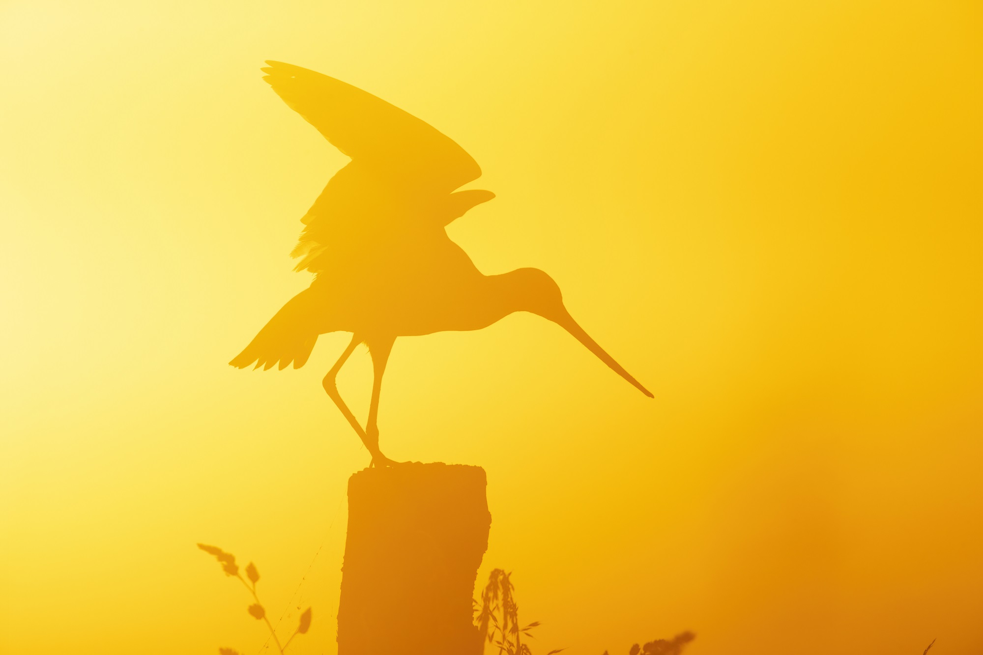 Grutto op hek in weide met ondergaande zon; Black-tailed Godwit in meadow during sunset