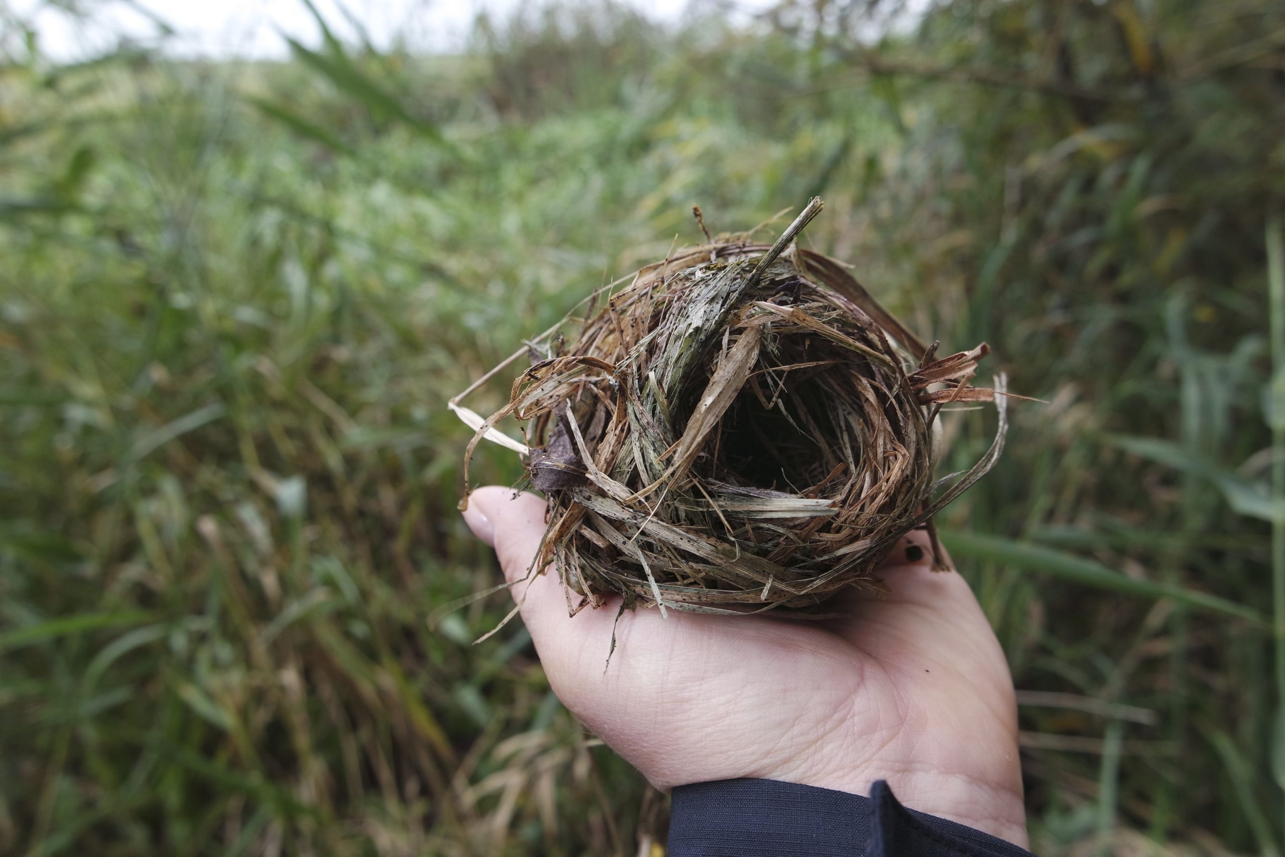 Een nest maar dan van een zoogdier. Het prachtige geweven bolletje van een dwergmuis. Foto: Jeroen Kloppenburg