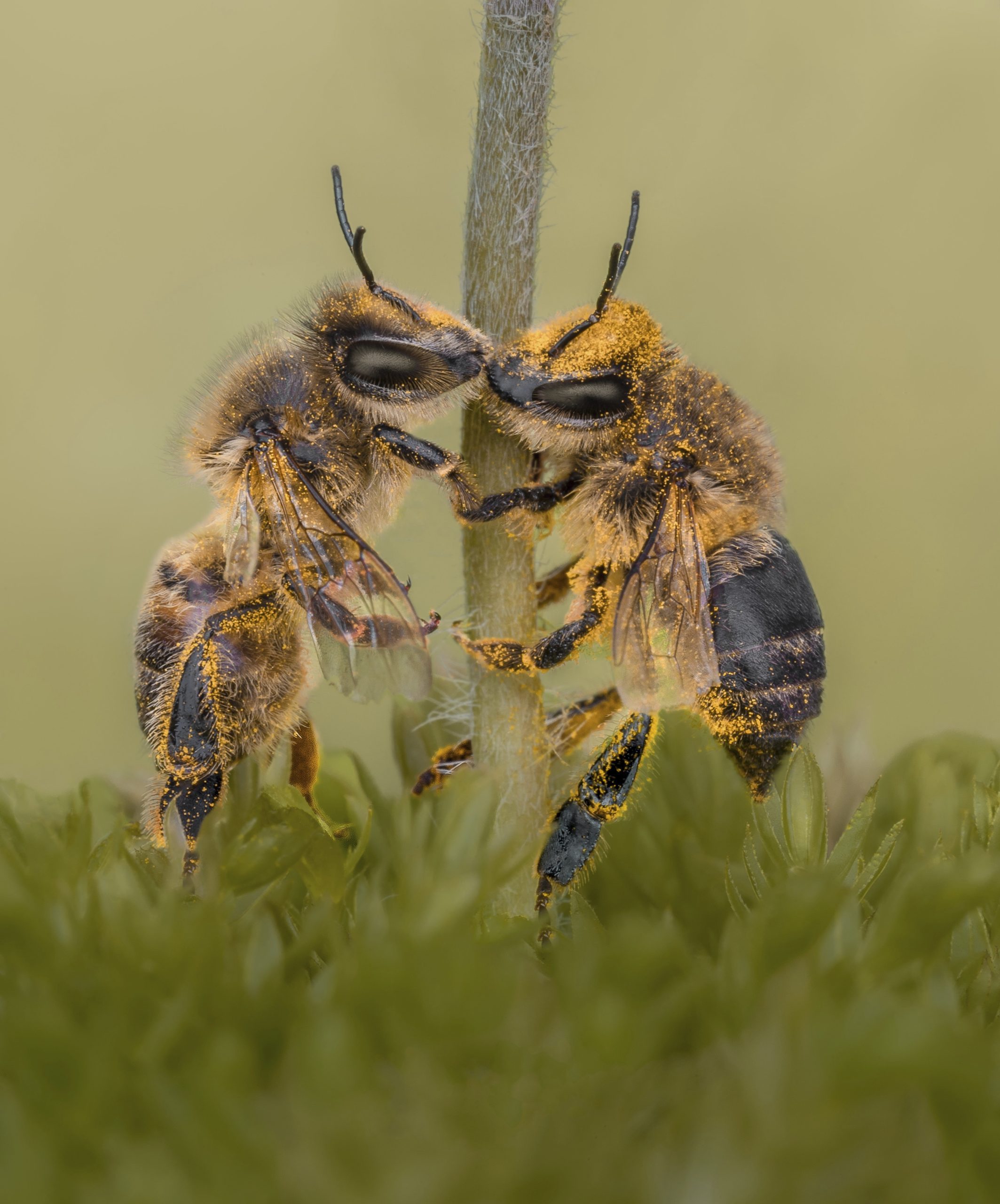Niet alleen de interactie tussen de bijen, ook het bijna lichtgevende stuifmeel maakt deze foto heel bijzonder.