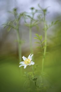 De verticale tweedeling in deze foto is heel spannend. Een wit/paars gedeelte en een groen gedeelte. De verbinding tussen deze twee vlakken wordt gemaakt door de bosanemonen: in beide vlakken is een geopende bloem te zien.