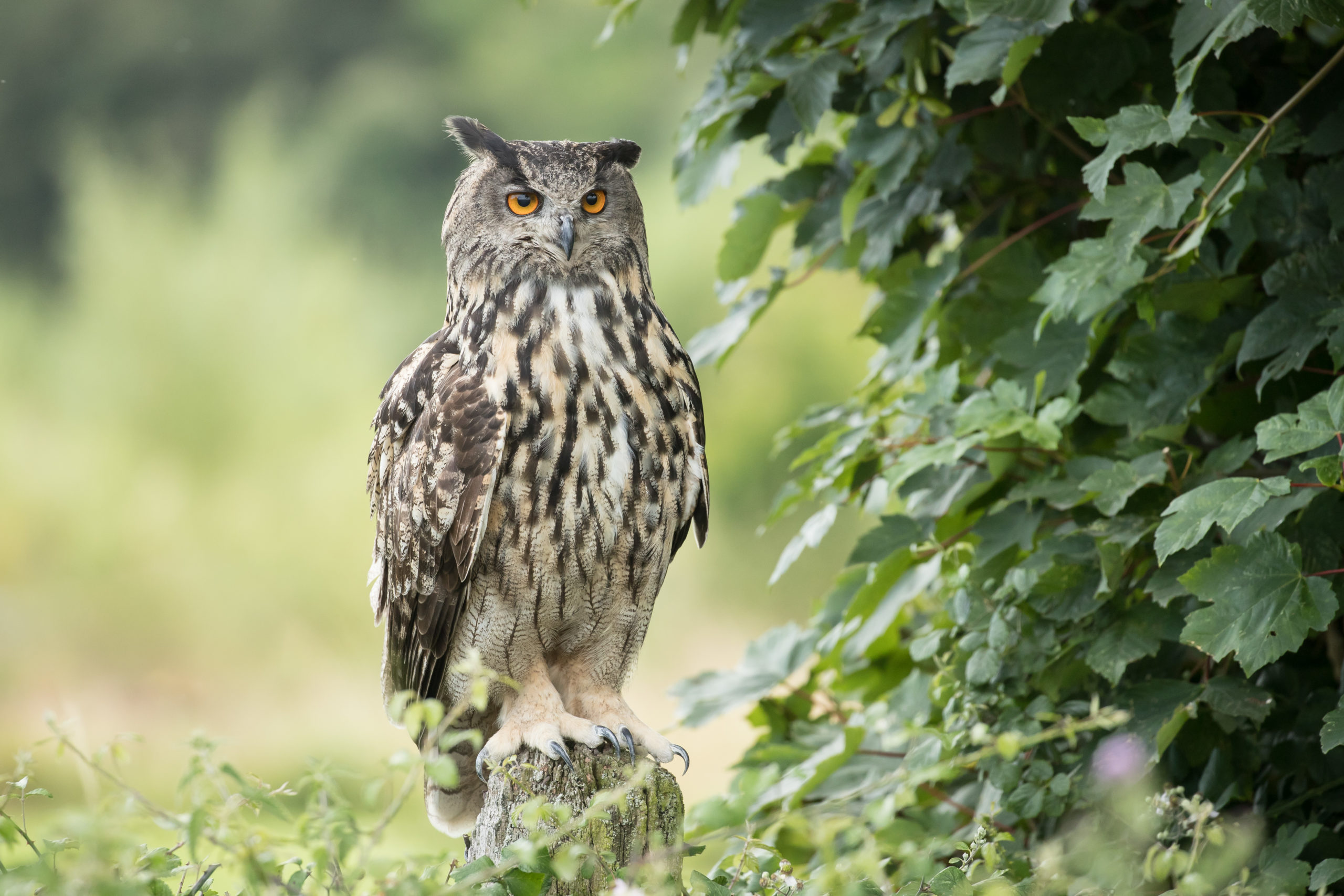 Misschien wel de meest geliefde uil van Nederland: de oehoe. Zijn verschijning is indrukwekkend, de felgekleurde oranje-gele ogen, zijn lengte van 70 centimeter (vrouwtjes, mannetjes zijn 10 centimeter kleiner), hun lange oorpluimen en de enorme klauwen met 3 centimeter lange nagels!