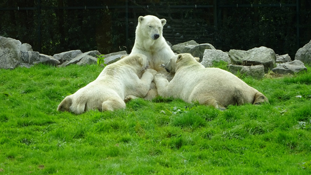 Op de foto staat een ander ijsbeervrouwtje uit Dierenrijk: Frimas, met haar 2 jongen Noordje en Pixel.