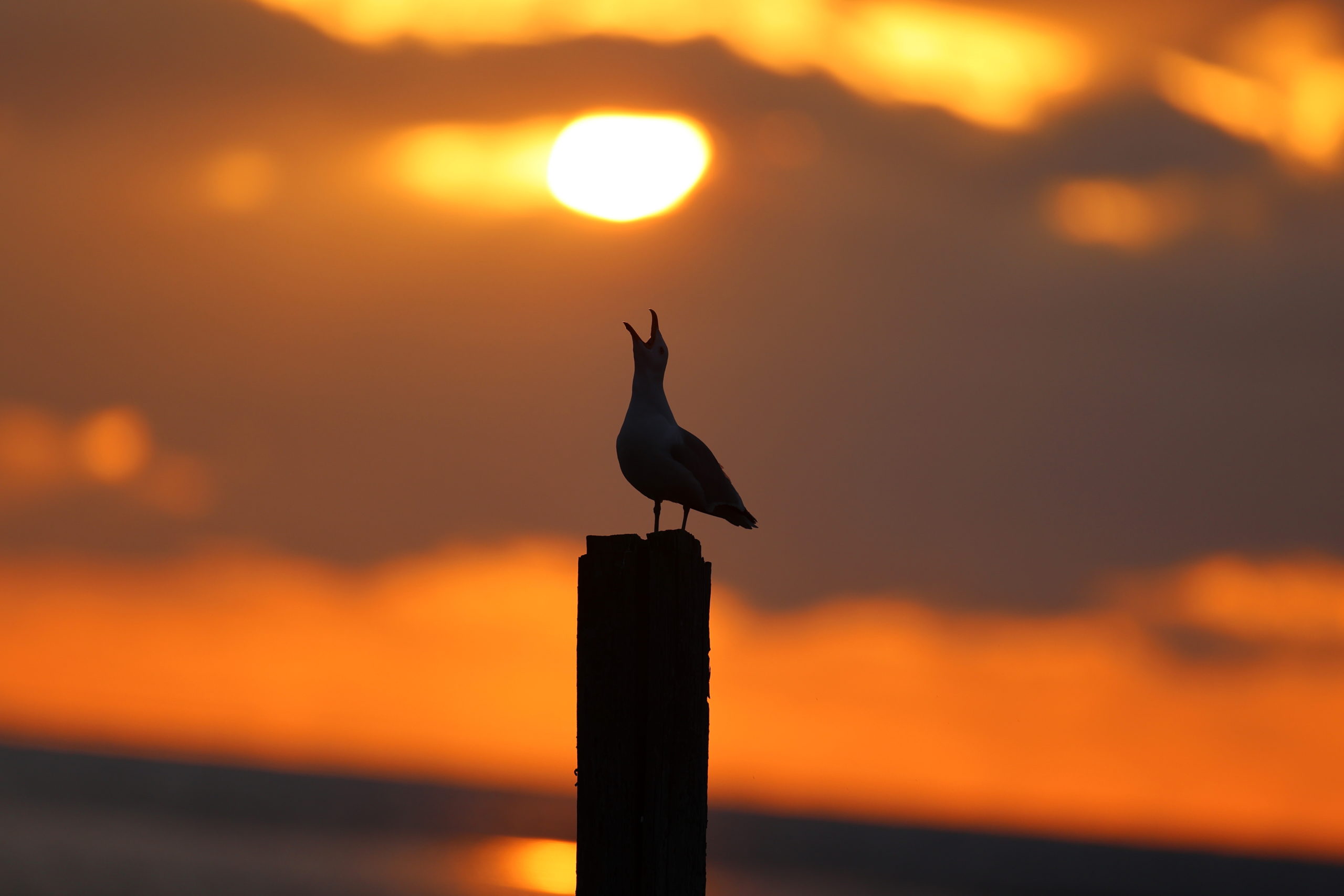 Zilvermeeuw ‘kraait’ bij zonsopkomst. Foto: topvantexel