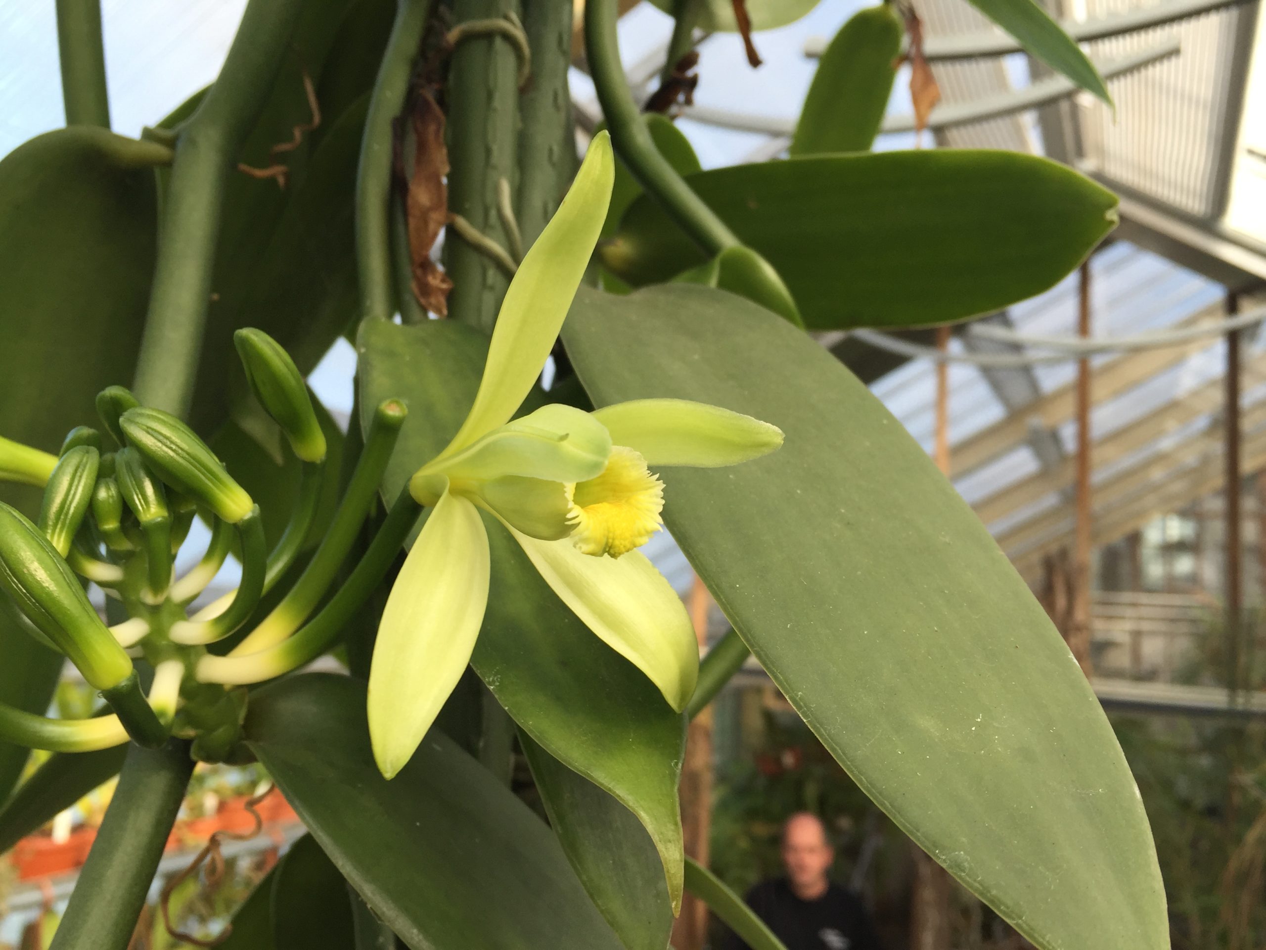 Voor het eerst in het 426 jarig bestaan van de Leidse Hortus staat de Vanilla planifolia in bloei. Oftewel de vanille-orchidee. Deze bloem levert het beroemde vanillestokje voor culinair gebruik. De bloemen bloeien nogal kort, dus als je het wilt zien is haast geboden! En omdat er geen natuurlijke bestuiving plaats kan vinden in de kas van de Leidse Hortus wordt er in de kortstondige bloeiperiode een handje geholpen bij de bestuiving. De plant komt oorspronkelijk uit Mexico.