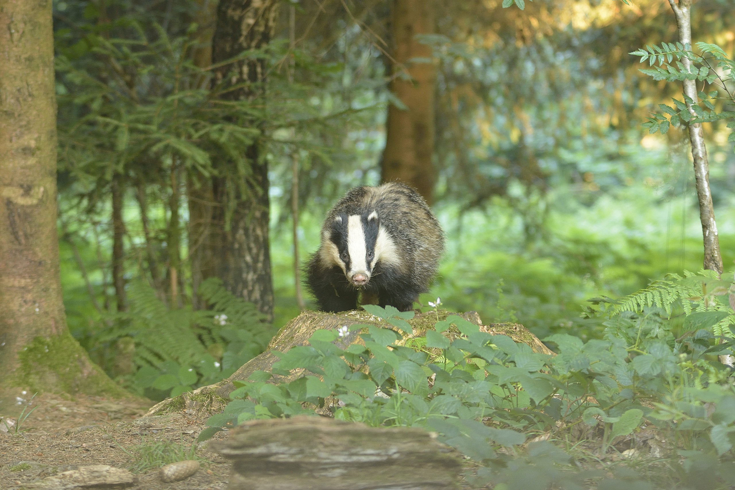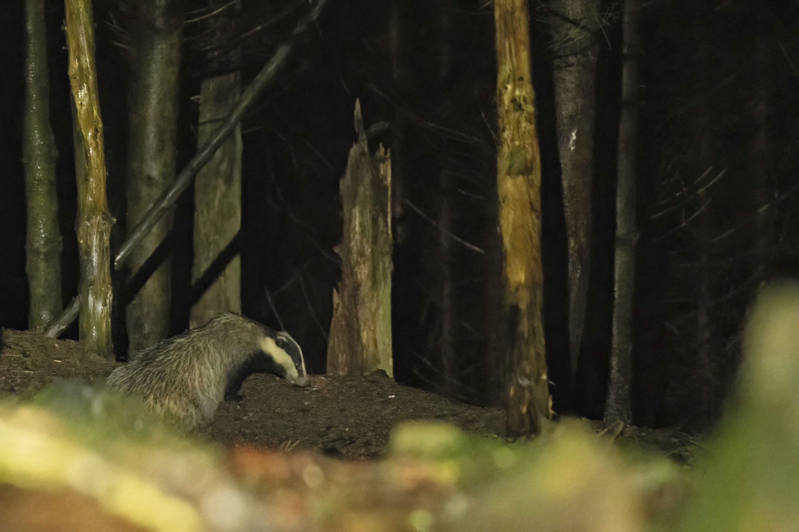 Terwijl we wachten horen we de eerste burlende herten en bij elke tak die kraakt hoop ik op een koppel wilde zwijnen. Plotseling steekt een eerste das zijn kop uit de burcht… Wat een machtig beest is het toch. Met hun mooie zwart-wit getekende kop zijn de dieren ook in het inmiddels donkere bos goed te zien. Na de eerste das volgen al snel nummer twee en drie en is de show begonnen. Ze scharrelen de hele bosvloer af op zoek naar iets te eten. Dan zie ik nog iets bewegen in de grote uitgang van de burcht en in plaats van een vierde das komt er een vos naar buiten. Prachtig om te zien dat deze dieren zonder problemen naast elkaar in dezelfde burcht leven.