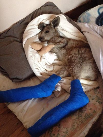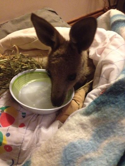 In de buurt van Kilmore in Australië woedt al dagen een grote bosbrand. Veel mensen hebben er hun huis moeten verlaten en ook wilde dieren zijn op de vlucht geslagen. Zo ook deze jonge kangoeroe die momenteel opgevangen wordt in het Wild about Wildlife Rescue Centre in Kilmore. Alle vier zijn pootjes zijn geschroeid door de hete aarde. Het diertje maakt het naar omstandigheden goed en heeft zijn eerste maaltje alweer met smaak opgegeten.1606959_738956479450875_763841358_n