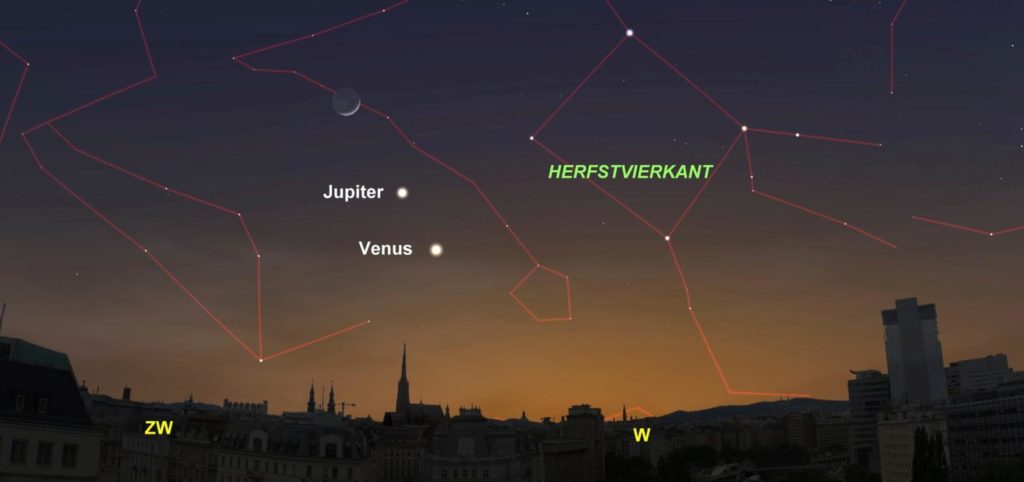 De komende week zijn aan het begin van de avondschemering twee heldere ‘sterren’ aan de westzuidwestelijke hemel te zien: de planeten Jupiter (linksboven) en Venus (rechtsonder). In de loop van de tijd wordt hun onderlinge afstand snel kleiner.
