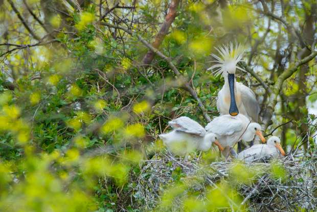 Jonge lepelaars in een verlaten nest van een blauwe reiger, aan de rand van Haarlem. Foto Paul Bohre
