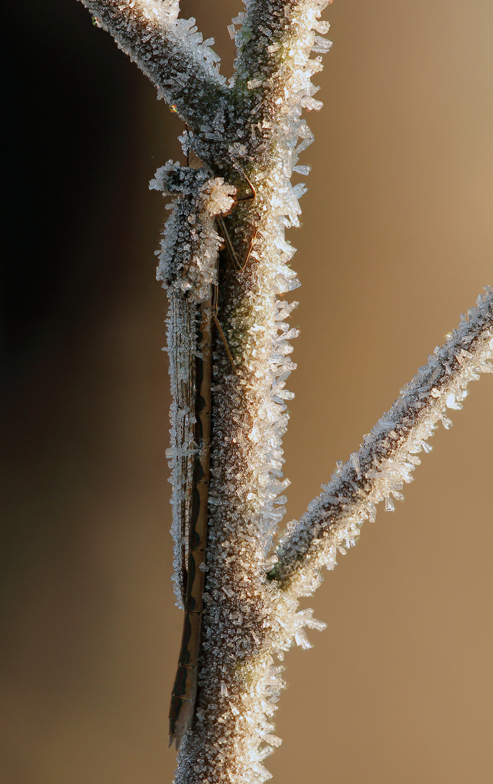 Winterjuffers kun je rond zien vliegen van eind juli tot eind oktober. Vaak zwerven ze uit naar gebieden die ver weg van hun waterrijke ‘geboortegrond’ liggen. Dat kan ook, want winterjuffers planten zich pas voort in het voorjaar. In de herfstmaanden zoeken ze een beschutte plek om te overwinteren, meestal een pol pijpenstrootje of een struik heide. Daar kruipen ze dan diep in weg. Vaak zijn ze ook nauwelijks zichtbaar door hun bruinige kleur. Hangend aan een stengel wachten ze daar rustig op de eerste tekenen van het voorjaar. Het is dus goed zoeken naar deze overwinteraars. Als het je lukt om er één te vinden kan dat een prachtige foto opleveren van zo’n met rijp beslagen winterjuffer.