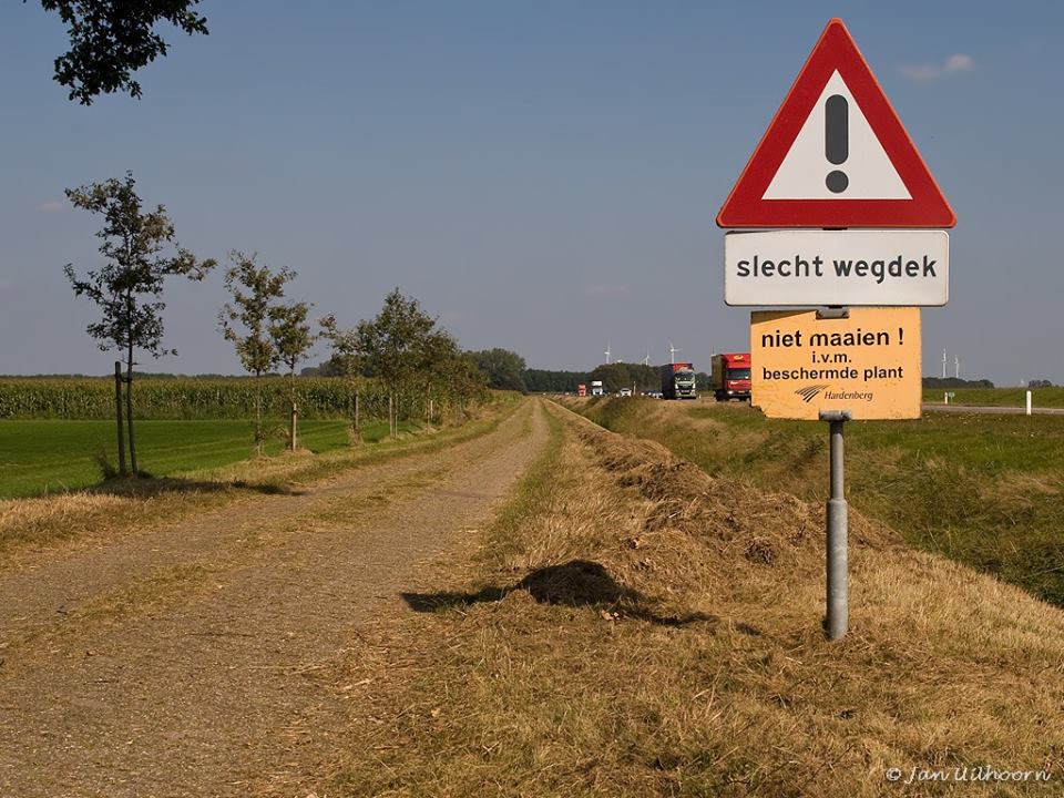 Er staat een duidelijk bord op deze weg bij Gramsbergen (gemeente Hardenberg): er mag niet gemaaid worden in verband met beschermde planten. Volgens omwonenden zou het hier om orchideeën en de rivierduinzegge gaan.
