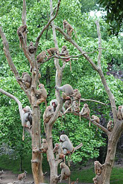 De 112 mantelbavianen in het dierenpark Emmen zitten in grote stress. Sinds maandag hebben ze zich verschanst in een aantal kale bomen en een hoge rots en zijn daar bijna niet weg te krijgen. Ze eten maar mondjesmaat en maken nauwelijks geluid. Een vreemde gewaarwording.