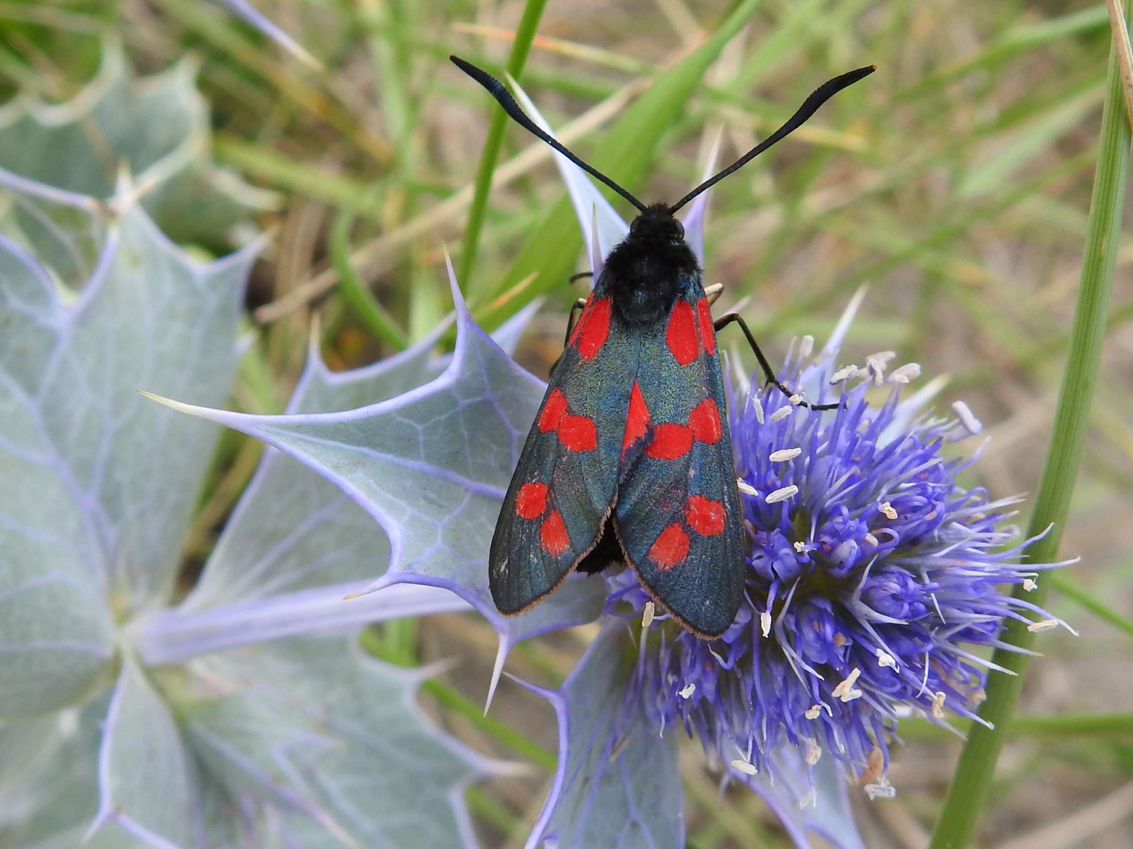 De blauwe zeedistel is als nectarplant bijzonder in trek bij bijen en vlinders, zoals dagpauwoog en Sint Jansvlinder (foto in de kop). Van de vele insecten die de bloemen bezoeken, zijn de zogenoemde harkwespen de meest bijzondere. Deze wespen leven op open zand en danken hun naam aan het ‘aanharken’ van het zand bij de nestopening. Lange doorns aan de voorschenen fungeren daarbij als hark.