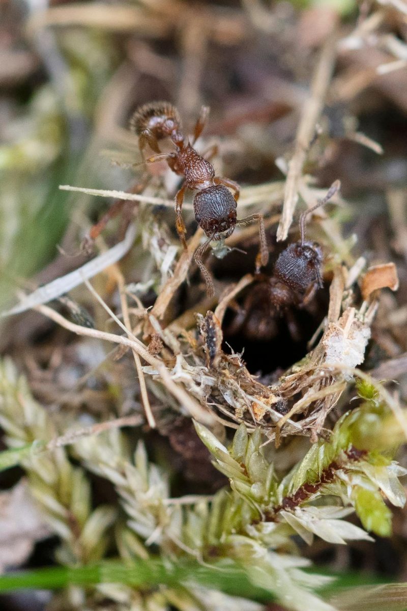 Snel heeft hij succes: “Kijk, hier heeft een leuke mierensoort zijn nest!” Noordijk wijst op een aantal kleine openingen in de grond van hooguit een centimeter in doorsnee. De openingen zijn kokervormig en rechtopstaand, gemaakt van plantaardig materiaal. En nu pas, na beter kijken, zie ik ook heel kleine mieren – donkerrood en slechts 5 millimeter klein – in en uit lopen. “Dit is de kokersteekmier”, zegt Noordijk met een glimlach. “Mogelijk spelen de opgehoogde nestingangen een rol bij de verdediging tegen indringers”.