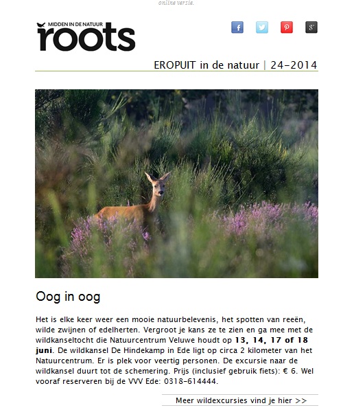Roots publiceert sinds kort ook een wekelijkse nieuwsbrief. De redactie selecteert daarin de beste en leukste natuuruitjes, zo ben je altijd op de hoogte van nieuwe exposities, natuurfilms, excursies, fotoworkshops en andere natuuruitjes.