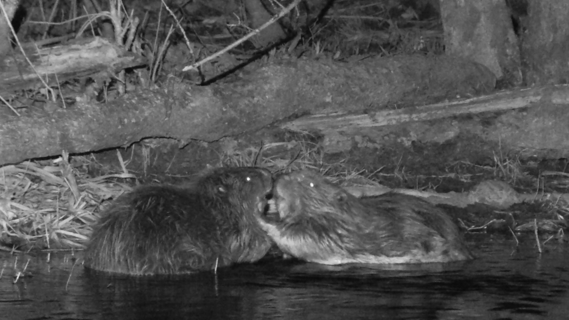 De vlooiende bevers, vastgelegd met de infraroodcamera.