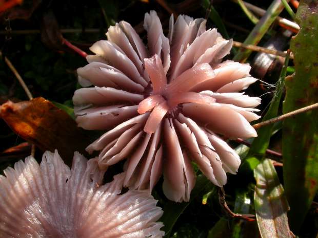 Ondertussen is Meijvogel naarstig op zoek naar de must-see onder de wasplaten: het papegaaizwammetje. Opeens vindt hij er een. “Kijk, deze heeft een helemaal groene steel. Bijzonder, want dat hebben ze maar een dag in hun korte leven.” Er omheen staan er nog meer, maar alleen de eerste die we vonden heeft inderdaad zo’n gifgroen steeltje. Heel apart. Iets verderop komen we de zwartwordende wasplaat tegen, een paddenstoeltje dat eerst oranjerood is, maar later zwart kleurt. Dan vinden we een heel apart gevormde vermiljoenwasplaat. De ochtendzon schijnt er dwars doorheen. En, inderdaad, het is net een ontluikende orchidee. Nooit geweten, maar nu wel met eigen ogen gezien.