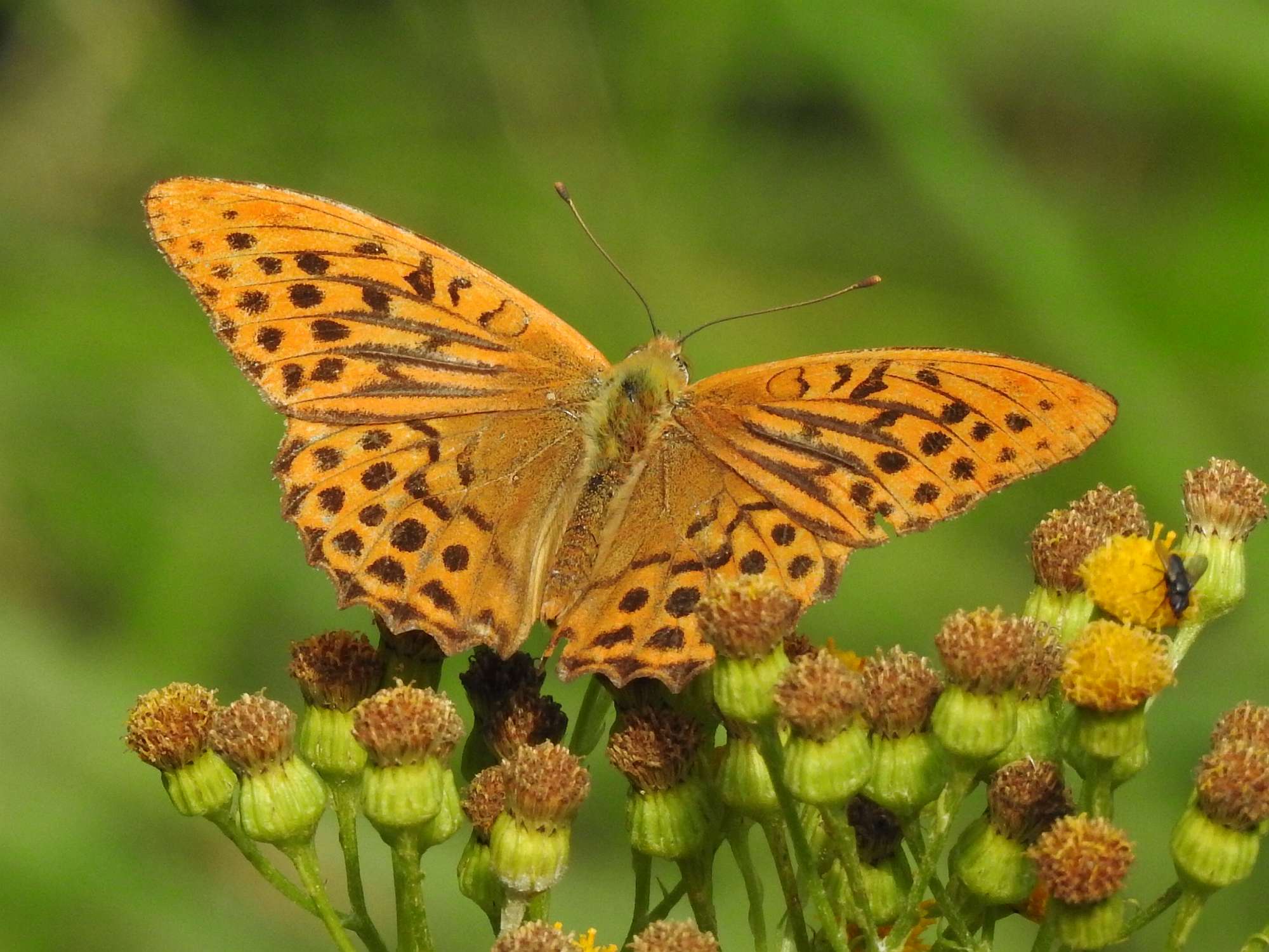 Op Waarneming.nl had ik tevoren de tijden gecheckt waarop de vlinders de dagen ervoor zijn gespot. Rond 9.30 uur komen we aan in het gebied en stappen op de fiets. We maken vandaag voor het eerst een fietstocht door het gebied van Castricum met als einddoel het strand bij Wijk aan Zee. Er staat toch nog een pittig windje uit het zuidwesten dus het is wel even flink doorpezen, vooral door het open duingebied aan de westkant. Vanuit Wijk aan Zee koersen we door het meer beboste gedeelte weer terug. Ineens flapt er een enorme oranje vlinder over het fietspad: bingo! Een keizersmantel landt even later op boerenwormkruid en warmt meteen zijn prachtige oranje vleugels op in de zon. Wat een magnifiek mooie vlinder! Maar al snel vliegt hij naar boven om hoog in een struik zich verder op te warmen. Het zonnetje komt nu aardig door.