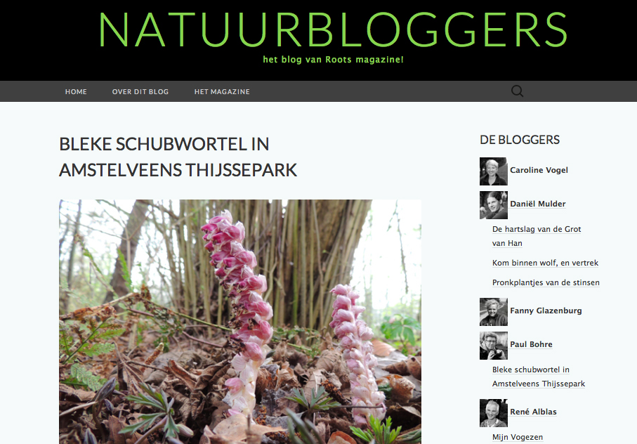 En toch vonden we dat nog niet genoeg. Want nu is er de Rootsblog “Natuurbloggers”. Op deze blog schrijven alle redactieleden over hun natuurbelevenissen, hun natuurgedachten, hun natuurkennis enzovoort enzovoort. De blog is het persoonlijke visitekaartje van Roots, er worden elke week minstens 3 nieuwe blogs geplaatst over de meest uiteenlopende onderwerpen zoals vogelen met Paul Böhre, filosoferen over natuur door Daniël Mulder en het leven op een berg in de Vogezen door René Alblas.