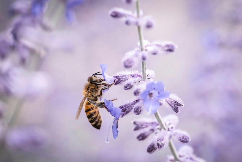 Het oordeel van de jury over deze foto: “Het sterke punt van deze foto is het contrast tussen de compleet paarse omgeving en de goudgele honingbij. Een mooi detail zijn de haartjes die je op de bij en op de bloemen kunt zien.” Foto: Danique Otten