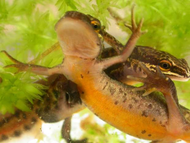 Eitjes en jongen: salamanders leggen hun eitjes in water. Ze vouwen ze met hun achterpoten tussen blaadjes van waterplanten. Hagedissen leggen hun eitjes en krijgen hun jongen op land.