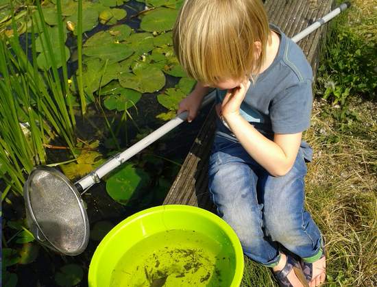 1. Tussen de waterplanten en in het bovenste laagje van de bodem leven de meeste waterdiertjes. Haal je schepnet of keukenzeef daarom een paar keer stevig heen en weer tussen de waterplanten.