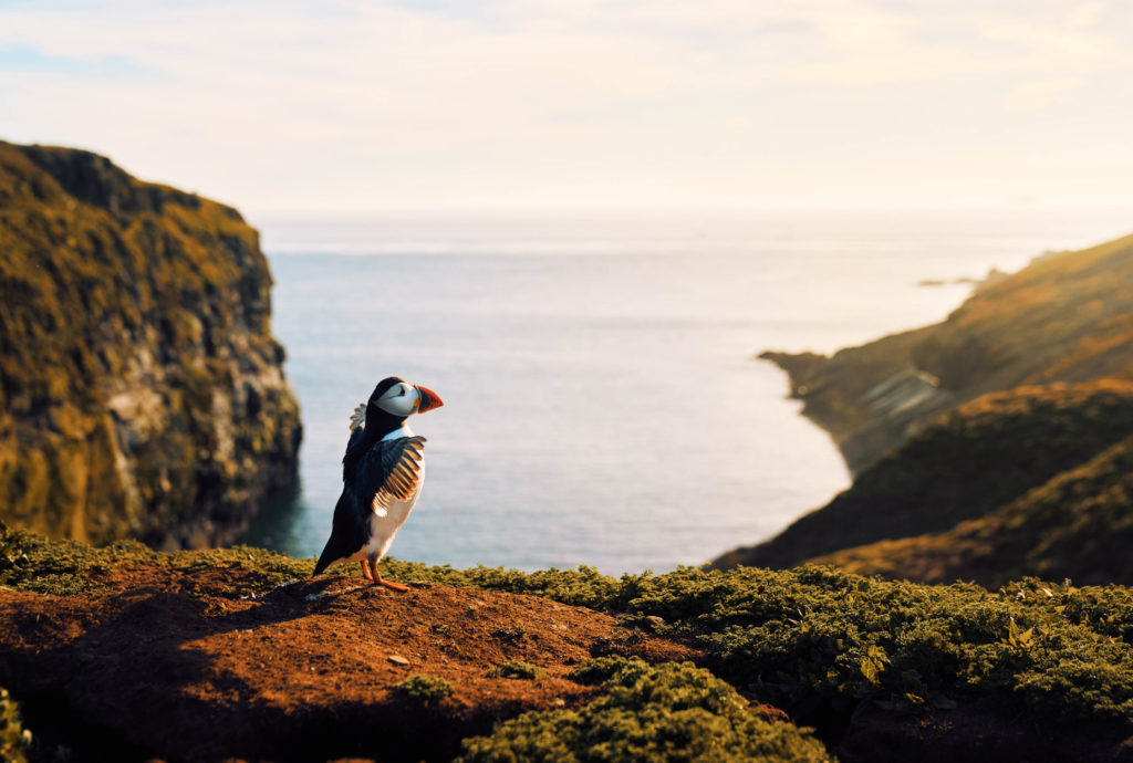 Wild Isles, 12 maart 2023. Aan het begin van de avond keren papegaaiduikers terug naar de kolonie. Ze nestelen onder de grond en blijven hun leven lang bij elkaar. Foto: © BBC/Silverback Films/Alex Board