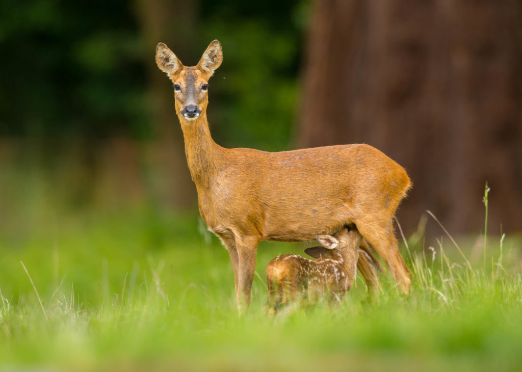 Wild Isles, 19 maart 2023. Een pasgeboren ree drinkt bij zijn moeder. Een jonge ree verroert zich urenlang niet, tot de moeder hen roept dat ze kunnen komen drinken. Foto: © BBC/Silverback Films/Jules Cox