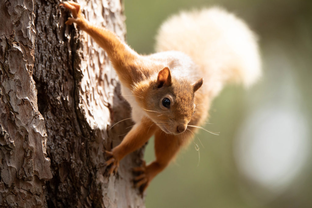 Wild Isles, 19 maart 2023. Een eekhoorn (Sciurus vulgaris) daalt af van een boom in de hooglanden van Schotland. Foto: © BBC/Silverback Films/Sam Duckerin