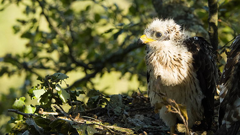 Wild Isles, 19 maart 2023. Een jonge wespendief (Pernis apivorus) inspecteert de omgeving in de buurt van zijn nest. Wespendieven eten geen honing, maar larven en poppen uit het nest – daarom stelen ze de honingraat. Foto: © BBC/Silverback Films/Harry Yates