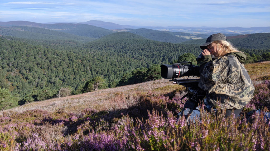 Wild Isles, 19 maart 2023. Regisseur Lily Moffatt maakt opnames van de vallei in Glen Tanar waar steenarenden nestelen. Het ‘adelaars team’ filmde op een waanzinnig mooie locatie, maar moest op de heuvel zijn voor 3 uur ’s ochtends en was pas rond 11 uur ’s avonds klaar met filmen (Engelse tijd). Foto: © BBC/Silverback Films/Chris Howard
