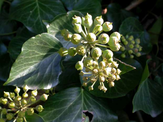 Een groenblijvende, houtige klimplant uit de klimopfamilie. ‘Onze’ liaan, die meters hoog kan worden en zich overal aan vasthecht door middel van luchtwortels. Bloeit nu in december, waarna in de lente zwarte bessen worden gevormd die gegeten worden door lijsters. Veel dieren overwinteren tussen de leerachtige bladeren of dorre bladeren op de grond.