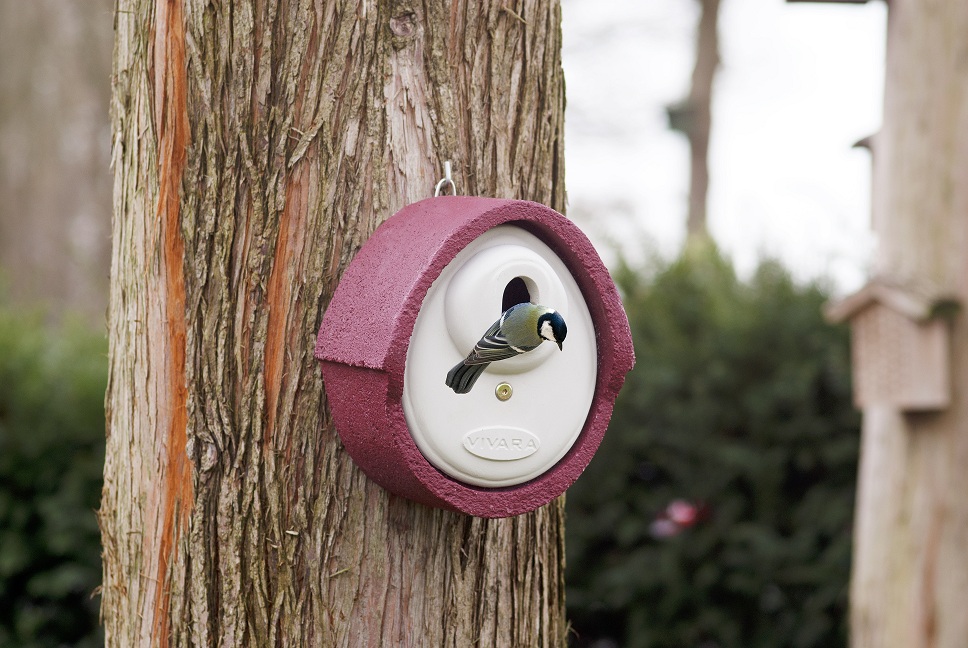 Deze duurzame nestkast van Vivara is gemaakt van houtbeton, een mengsel van houtvezels en beton. Dit unieke materiaal isoleert, ademt en gaat erg lang mee. De invliegopening heeft een ovale vorm en is daarmee geschikt voor de meest voorkomende tuinvogels zoals pimpelmeesjes, koolmezen, ringmussen, huismussen, boomklevers, bonte vliegenvangers en gekraagde roodstaarten. De kast is tevens voorzien van een roofdierbeveiling. Deze nestkast is verkrijgbaar in drie verschillende kleuren: rood, bruin en groen. Verkoopprijs is € 22,95.