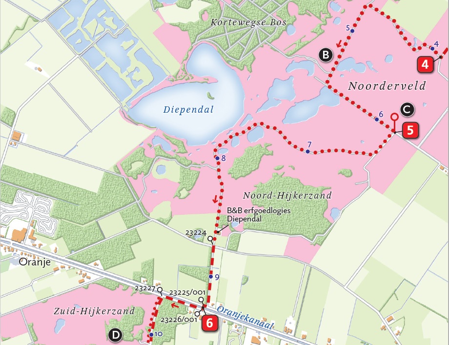 ‘5. Op verhard fietspad RA. Eerste graspad RA (Drenthepad). Pad volgen, over veerooster, langs bosrand lopen, klinkerweg op langs B&B Erfgoedlogies Diependal. Vervolgens RD het fietspad op. Aan einde bij PS 23225/001 brug oversteken over Oranjekanaal.’