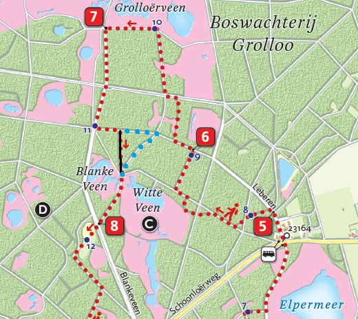 Routepunt 7: in de 3e regel staat: ‘Ga LA op bospad en verderop RA (rood paaltje).’ Door een wijziging in de rode paaltjesroute klopt dit niet meer. Het pad op de kaart dat Roots volgde bestaat ook niet meer, meldt Staatsbosbeheer. De oplossing is: ‘Ga LA op bospad en loop door tot kruising. Ga daar RA en volg rode route tot asfaltweg. Lees verder bij routepunt 8.’