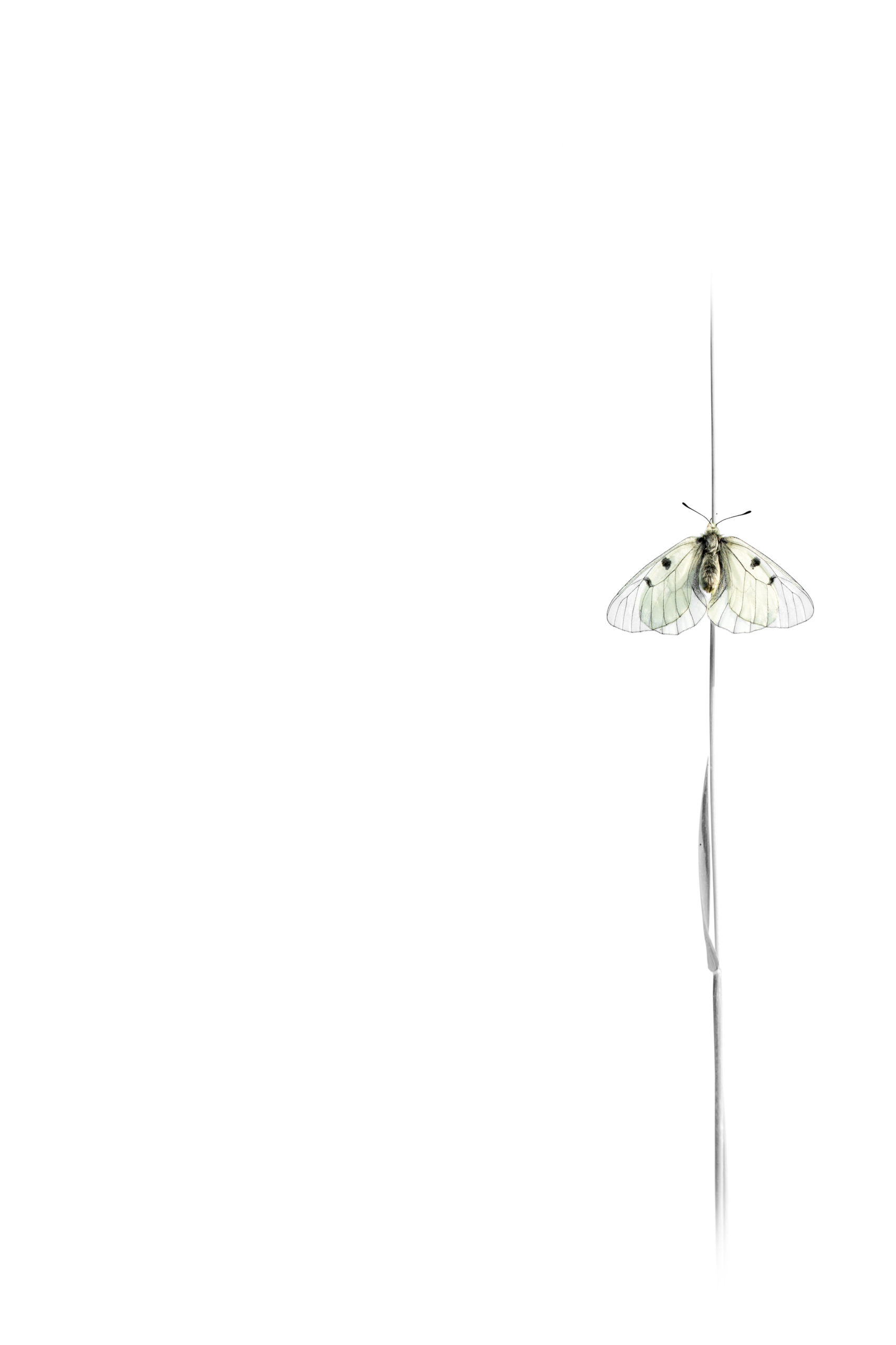 “Voor mijn fotografie geldt: hoe minder kleur hoe beter. Veel wit of juist veel zwart, monochroom. Heerlijk. Het gaat er mij dan vooral om dat het onderwerp alle aandacht krijgt. Die isolatie versterkt ook de fragiliteit van het onderwerp. Zeker als het om een beschermde diersoort gaat, zoals de zwarte apollovlinder. De zwarte apollovlinder lijkt wel wat op het groot koolwitje, maar die laatste heeft geen doorschijnende vleugeltipjes en de donkere vleugeladers zijn minder duidelijk aanwezig. Net zoals zijn grotere broer, de apollovlinder (zie Uitgelicht) is dit gewoon een vlinder met een enorme lading charisma. Geweldig dus om te fotograferen.