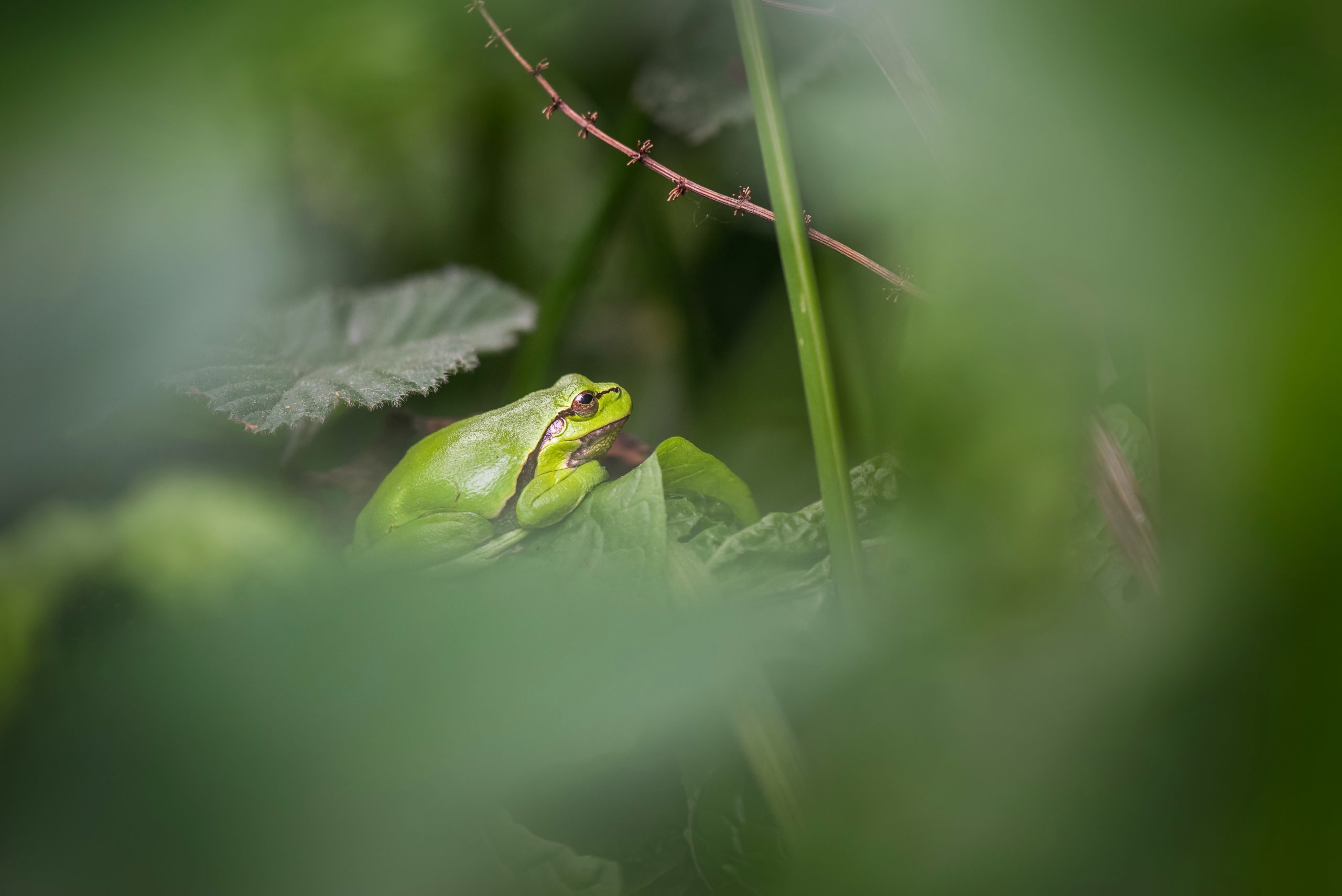 Alhoewel ze ‘boomkikkers’ heten, tref je ze zelden aan in een boom. Je zou ze beter struikkikkers kunnen noemen. Meestal zitten ze in braamstruiken; bovenop de bladeren of juist ín de struik op de takken. In mijn geval zaten ze ver verstopt in de struiken. Ondanks het perfecte weer was het deze keer moeilijk om de boomkikkers te vinden. Langzaam liep ik over het wandelpad en zocht ze laag bij de grond in de beschutting, maar ook bovenop de struiken waar de zon vol op stond. Toch had ik weinig geluk en zag ik geen enkele boomkikker. Omdat ik dit gebied regelmatig bezoek en vrij goed ken, wist ik dat ze er echt wel moesten zitten. Grote kans dat ik, zonder het te weten, al heel wat boomkikkers was gepasseerd. Ze zijn niet voor niks goed gecamoufleerd. Uiteindelijk, door goed tussen de takken en bladeren door te kijken, wist ik ze toch te vinden.”