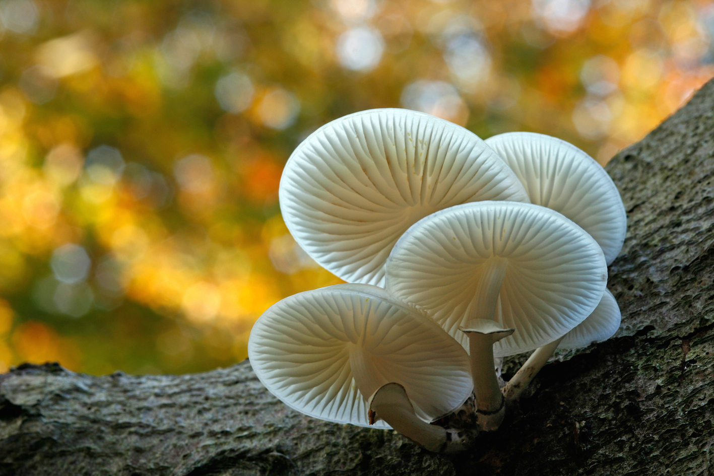 Na veel uitproberen koos ik dit standpunt, omdat de lamellen mooi oplichten in het tegenlicht. Ik heb daarbij wel gewacht tot de zon de hoedjes precies in het “spotlight” zette. Verder heb ik een reflectiescherm gebruikt om dit groepje uit te lichten. En natuurlijk gebruikte ik de herfstkleuren in de achtergrond als contrast.