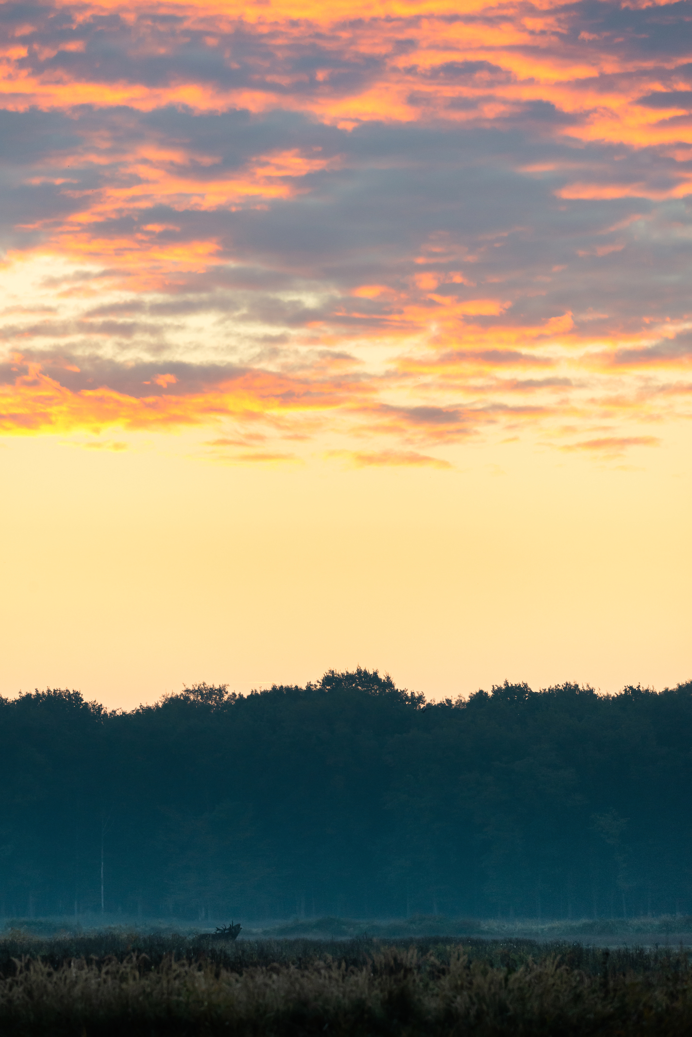 De foto die ik deze keer uit heb gekozen is daar een perfect voorbeeld van. Is het een typische bronstfoto geworden? Nee. Ik denk dat je heel goed moet kijken om überhaupt het edelhert te zien. Tijdens de edelhertenbronst ben ik dit afgelopen herfst met grote regelmaat in de ochtend op pad gegaan om zo min mogelijk actie te missen. Ik had bewust gekozen voor de ochtenden omdat ik het licht in de ochtend geweldig vind. In het donker kom ik op de locatie aan, niks te zien of te fotograferen in het donker, maar het geburl in de duisternis is magisch. Dit seizoen had ik al veel mooie foto’s gemaakt: in de mist, het gouden ochtendlicht, imposante bokken van dichtbij en foto’s in de stromende regen. Maar op het einde van de bronst tijdens mijn laatste ochtend fotograferen bij de edelherten, viel alles op zijn plaats. De lucht was prachtig gekleurd, in de verte liep een bok aan de bosrand in een laag mist. Plots stopte het mannetje en gooide zijn gewei in zijn nek. De stilte op de open vlakte werd doorbroken door een luid geburl, toen was het weer stil. Een mooier einde van het seizoen kon ik niet wensen. Het gevoel van toen komt weer boven bij het bekijken van deze foto.