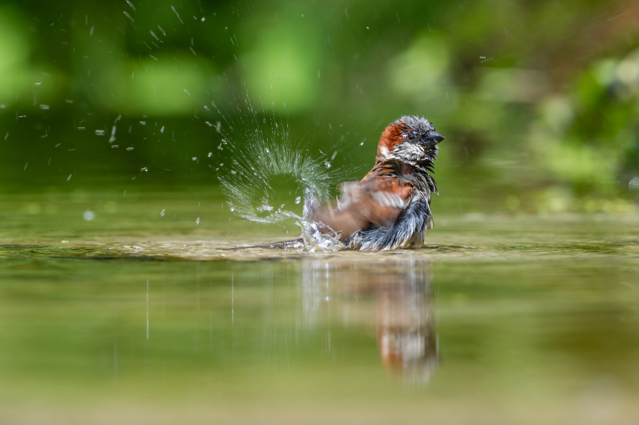 “Ik fotografeer graag in de natuur, vogelfotografie heeft daarbij mij voorkeur. Regelmatig bezoek ik een fotohut. Deze foto is gemaakt vanuit een vogelhut in Rijssen. Ik gebruikte een statief met een zo laag mogelijk standpunt om optimaal de spiegeling in beeld te krijgen. Terwijl de mus aan het badderen was viel het mij op dat de badderende vogel zijn koppie niet bewoog. Ik durfde het daarom aan om de sluitertijd te verlagen, naar 1/250 seconde. (Een sluitertijd die normaal gesproken te lang is om een bewegende vogel vast te leggen.) Mijn idee was dat de vleugels dan een mooie bewegingsonscherpte zouden krijgen terwijl de kop scherp zou blijven. Ik maakte de foto toen het gespetter en de beweging van de vleugels op zijn heftigst was. En het lukte: het opspattende water en de bewegende vleugels hebben een mooie onscherpte gekregen en de kop is scherp. Precies de dynamische foto die ik voor ogen had.”