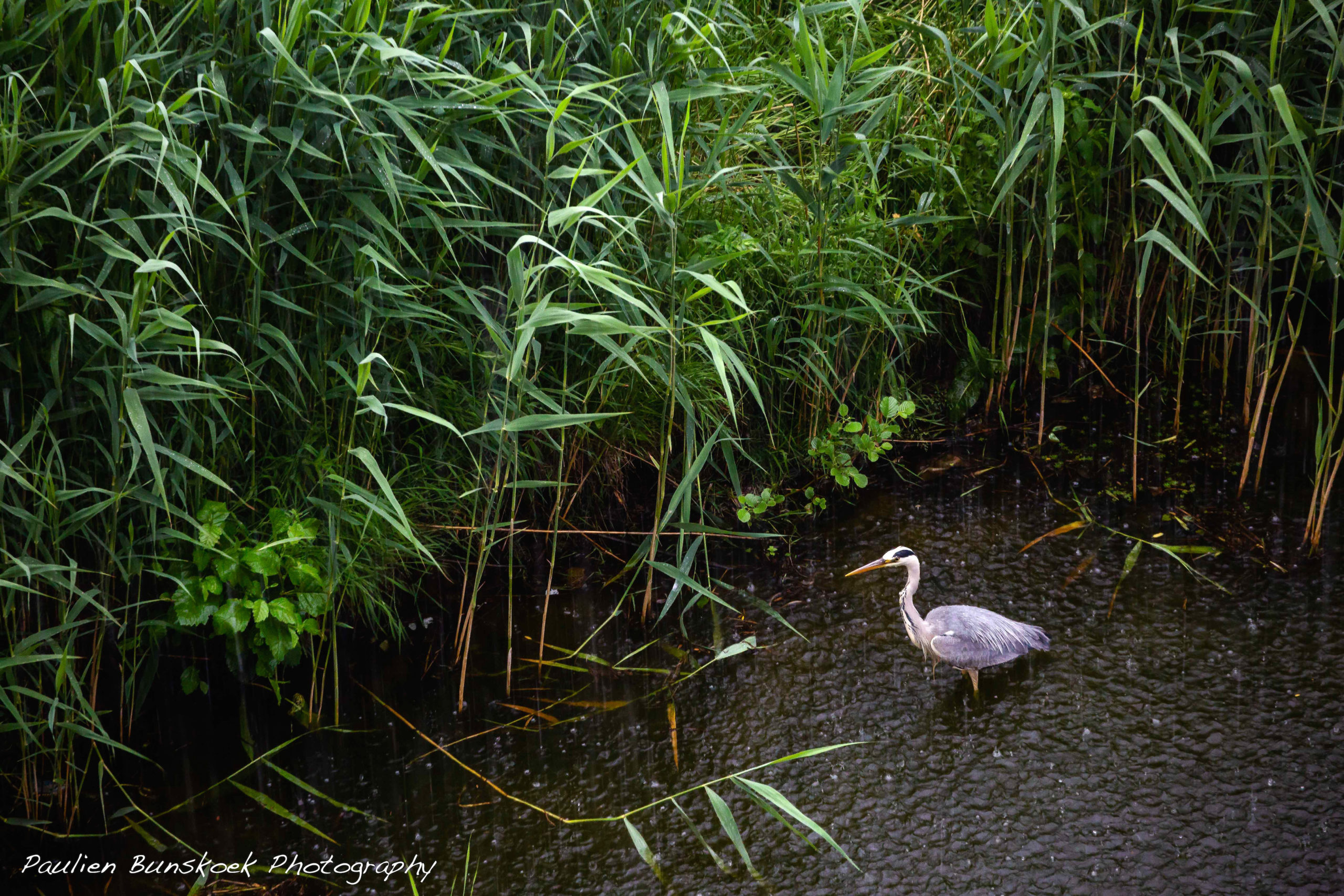 Laatst keek ik tijdens een flinke onweersbui naar buiten en tot mijn verbazing stond daar een blauwe reiger in de brede sloot. Die zie ik niet zo vaak midden in mijn woonwijk en ook de situatie was wel bijzonder. Door de zware regenbui was het vrij donker en viel de reiger des te meer op. Aangezien ik een overdekt balkon heb en dus droog kan staan heb ik mijn telelens op de camera geschroefd en ben ik foto’s gaan maken. Omdat ik bang was dat de reiger snel zou verdwijnen heb ik eerst uit de hand gefotografeerd maar hij stond daar zo rustig dat ik mijn statief erbij heb gepakt.