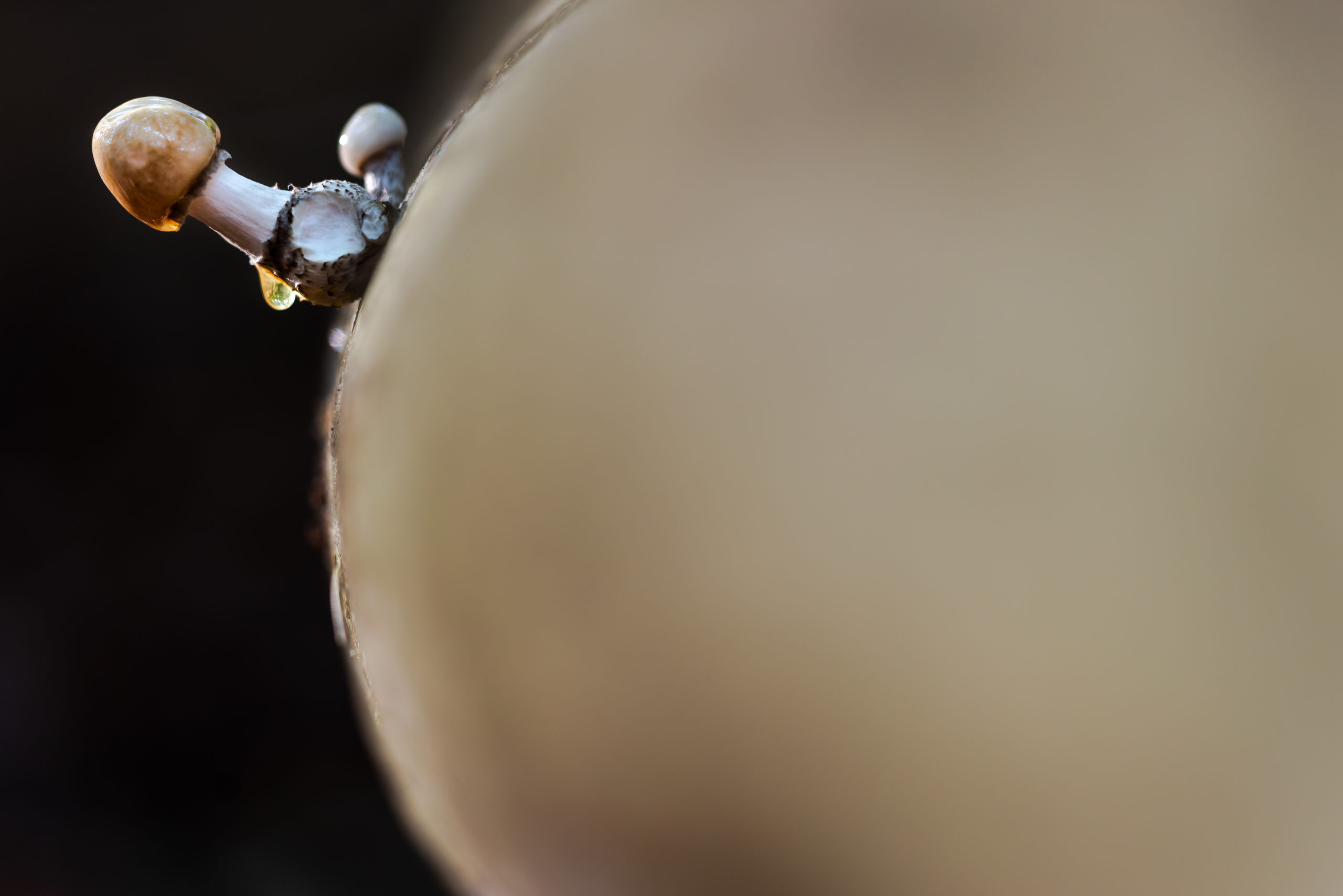 Deze foto is gemaakt met een Sigma 150 millimeter macro lens. Handmatig scherpgesteld door middel van liveview. ISO100, diafragma f/2.8 en de sluitertijd op 1/60. Mijn camera lag stabiel op een rijstzak en werd bediend met een bedrade afstandsbediening om trillingen te voorkomen. Omdat ik hier tegen de zon in fotografeer, gebruik ik spotmeting op de paddenstoel om toch een goede belichting te krijgen. Verder heb ik de foto 2 stops onderbelicht, om de hooglichten aan de rand van de paddenstoel niet uit te laten bijten. In de nabewerking heb ik vervolgens de puntjes op de ‘i’ gezet.”