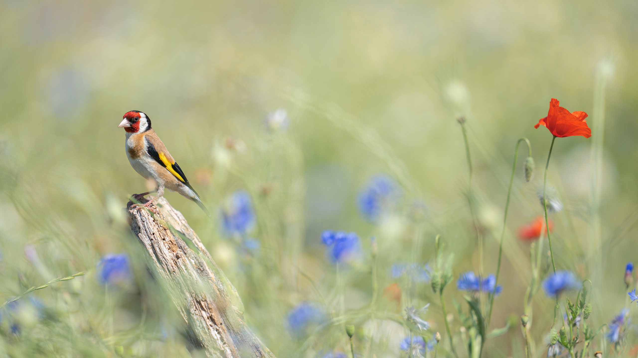 • Probeer iets met de kleuren van de vogel te doen. In deze foto komt het rood van de kop terug in de klaproos. Je zou ook kunnen kiezen voor het geel van de putter, bijvoorbeeld in een veld met boterbloemen.