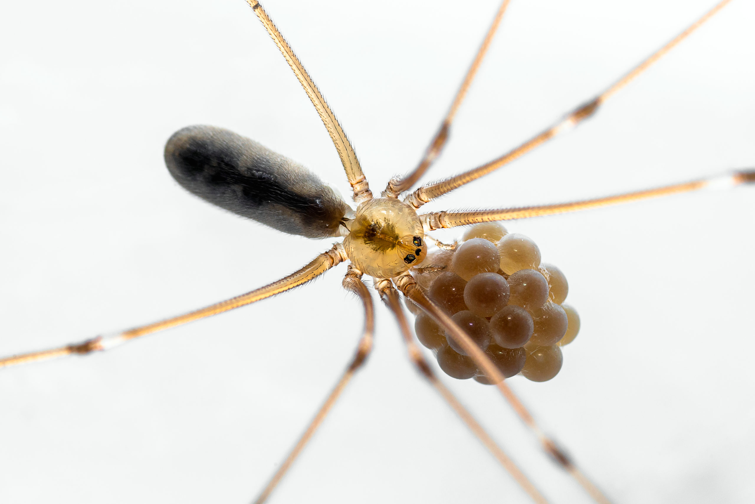Neem eens de tijd om dit diertje goed te bekijken. Deze minispinnetjes dragen ook vaak nog wat eitjes bij zich. Aan een ‘normale’ macrolens heb je eigenlijk niet genoeg, bij een vergroting 1:1 lukt het bijna niet om alle details zichtbaar te maken. Daarbij komt dat ze vaak hoog in een hoekje zitten. Vaak staat er een kast of iets anders in de weg en kun je het huishoudtrapje niet kwijt, met onmogelijke houdingen en gewicht ‘boven je macht’ tot gevolg. Ook het gebrek aan licht daar bovenin (zelf creëer je nog eens extra schaduw op je onderwerp!) zorgt voor wat problemen. Doe je de ISO omhoog? Teveel ruis. Diafragma open zetten? Te weinig scherptediepte. Sluitertijd dan maar omlaag? Oeps. Door de lastige houding kun je de camera niet stilhouden! En dan ook nog letten op de achtergrond. Juist doordat ze vaak in een hoekje hangen, heb je al gauw een lelijke ‘streep’ van de overgang muur-plafond in beeld. Ook dat nog.
