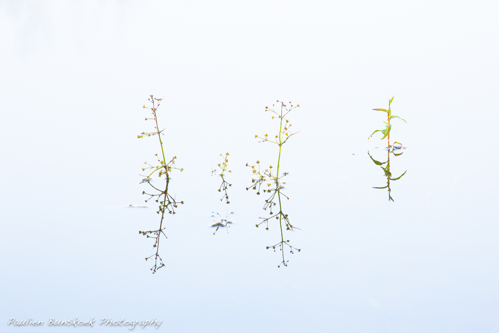 In een vennetje is vaak meer vegetatie dus het is soms best even zoeken om een strak beeld te krijgen zonder andere storende elementen. Om een deel te isoleren heb ik een telelens gebruikt. Ik wilde de subtiele herfstkleuren goed uit laten komen, dus ik heb hier flink overbelicht, wel bijna 3 stops. Als ik dit niet had gedaan waren de plantjes te donker geworden. Omdat het plantje rechts verder naar achteren staat dan de linker drie plantjes moest het diafragma naar f/13 om voldoende scherptediepte te krijgen. Ik heb vanaf een statief gefotografeerd. Ik vind dat prettiger, het geeft me rust om een mooie compositie te vinden en bij een sluitertijd van 1/6 sec moet het ook wel. In de nabewerking heb ik de foto nog iets gecropt en de kleuren nog wat opgehaald.