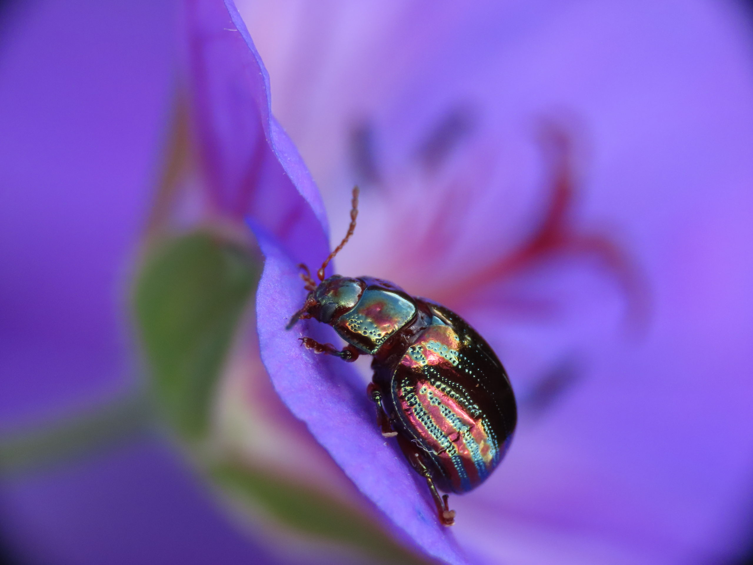 “De foto van het torretje heb ik genomen in mijn eigen tuin. Het is een rozemarijngoudhaantje. Dit goudhaantje zat in een oude lavendel plant. Daar heb ik hem voorzichtig uitgehaald. En omdat het een kleurrijk torretje is, heb ik hem op een kleurrijk bloemetje gezet en laten lopen. Zo kon ik hem mooi fotograferen in allerlei posities! Daarna heb ik het torretje natuurlijk weer terug gezet op de lavendel plant.”