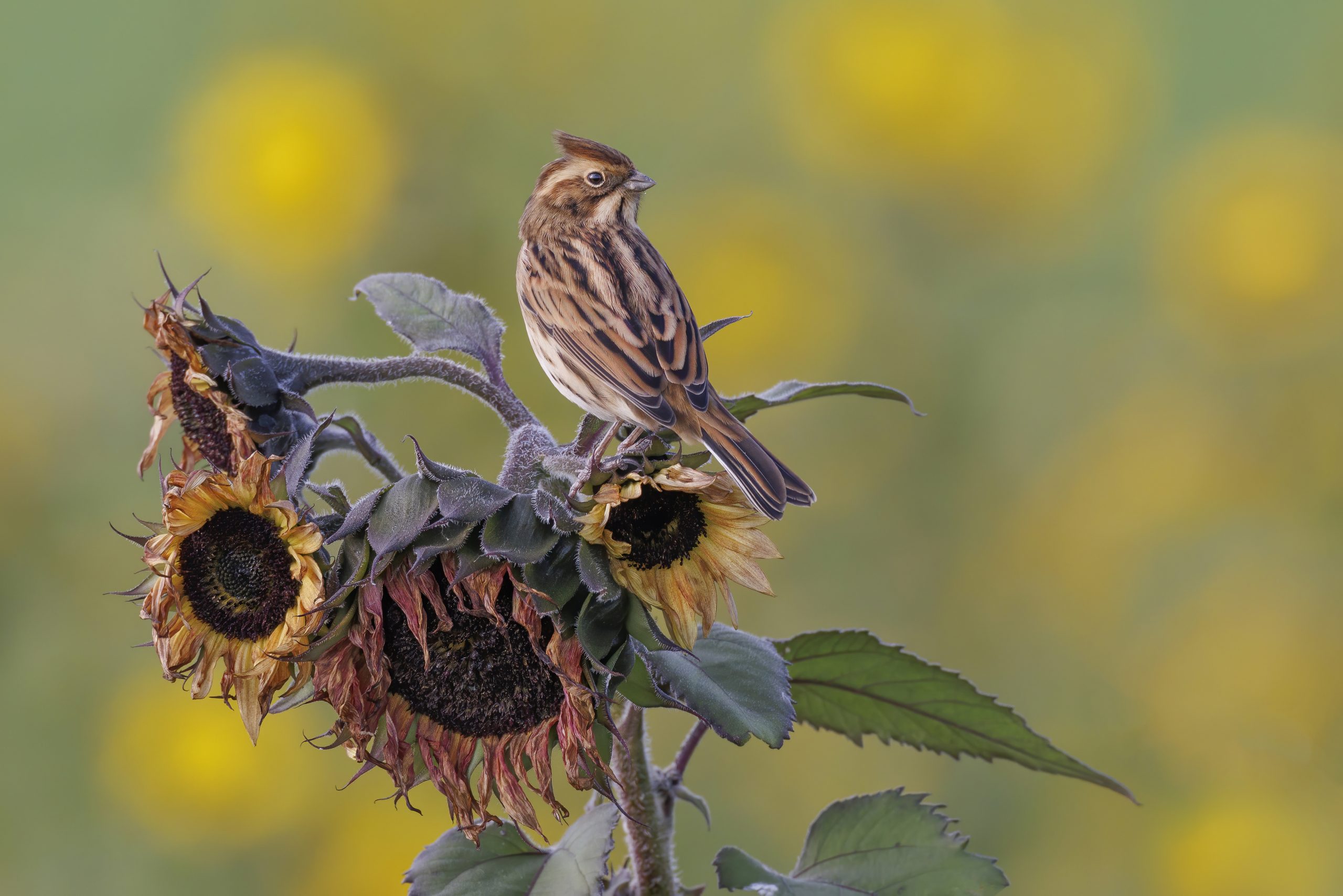 Ieder jaar aan het einde van de zomer zijn de akkerranden een hoorn des overvloeds voor vogels, door alle zaden die er te vinden zijn. Ook vind je er nog laat bloeiende bloemen die insecten aantrekken. In de periode van de vogelmigratie vind je er onder andere putters, groenlingen, kepen, paapjes en roodborsttapuiten. Die vetten daar op voor de lange reis. Het is er dus ook een hoorn des overvloeds voor vogelfotografen. Deze groep brons gekleurde zonnebloemen had ik al langer op de korrel, ze staken hoog boven de andere bloemen uit en waren daarom een geliefde plek voor vogels om even de omgeving te verkennen. Ik heb net zo lang gewacht totdat de bloemen gingen verwelken. Ik vind vergankelijkheid vaak meer karakter geven aan een foto. Daarna was het een kwestie van wachten totdat de juiste vogel, met het juiste licht en de juiste houding op de zonnebloemen ging zitten. Wat dan ‘juist’ is, dat is een gevoel en persoonlijke smaak. Ik vind de kleur van de rietgors mooi complementair aan de zonnebloemen en de -ruggelings over de schouder houding- spreek mij altijd erg aan. Dat er dan net een windvlaag komt en het kuifje opwaait is een bonus en puur geluk.
