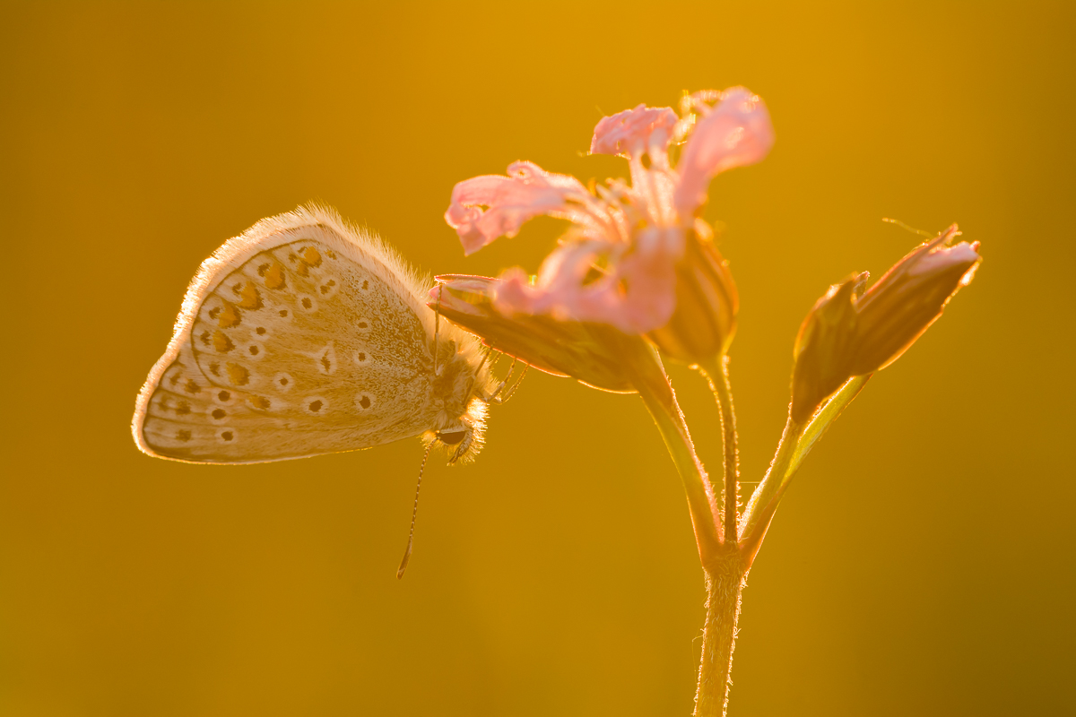 • Fotografeer niet je onderwerp, maar fotografeer het licht! Klinkt simpel toch? En dat is het ook. Kijk maar eens naar onderstaande foto. Het icarusblauwtje is weliswaar een mooie vlinder en de echte koekoeksbloem is een prachtige bloem, maar zonder het warme licht van de ondergaande zon was deze foto niet half zo mooi. Dit is ook de reden dat ik het liefst met zonsopkomst en met zonsondergang op pad ga om te fotograferen. Het licht is dan veel zachter en de lage zon kleurt alles in met rood en oranje. Zelfs de meest simpele onderwerpen leveren dan nog sfeervolle plaatjes op, zeker als je, zoals ik bij deze foto heb gedaan, gebruik maakt van tegenlicht.